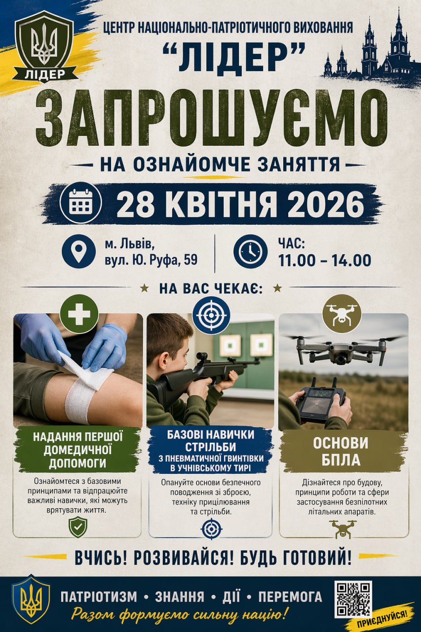 Центр національно-патріотичного виховання «Лідер» запрошує всіх охочих на ознайомче заняття, яке відбудеться 28 квітня 2026 року у місті Львів (вул. Ю. Руф