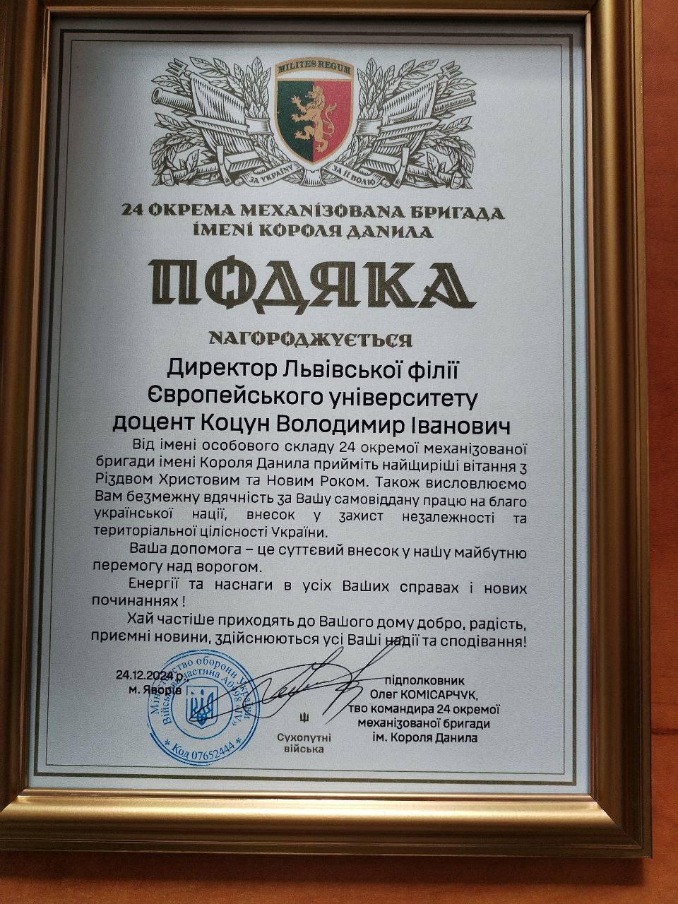 Львівська філія ПВНЗ «Європейський університет» неоднарозово долучалась до волонтерської підтримки різних військових бригад, зокрема 24-ї ОМБр імені короля Данила, про що свідчать численні подяки.