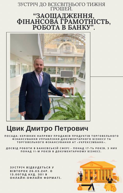 26.03.2024 року о 13.00 У Львівській філії відбудеться ЗУСТРІЧ ДО ВСЕСВІТНЬОГО ТИЖНЯ ГРОШЕЙ НА ТЕМУ: "ЗАОЩАДЖЕННЯ, ФІНАНСОВА ГРАМОТНІСТЬ, РОБОТА В БАНКУ"