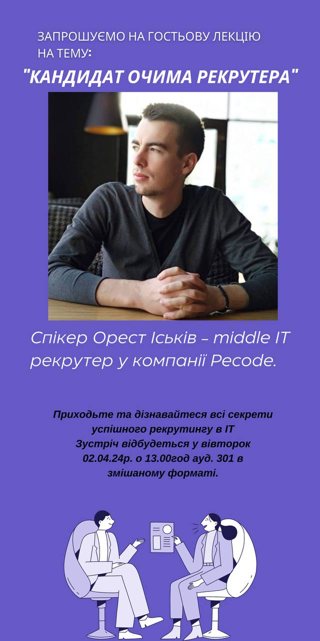Запрошуємо на гостьову лекцію Ореста Іськіва на тему “Кандидат очима рекрутера“, яка відбудеться 02.04.24 о 13.00 год. у Львівській філії ПВНЗ «Європейськ