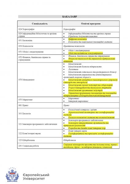 СПЕЦІАЛЬНОСТІ ТА ОСВІТНІ ПРОГРАМИ ЄВРОПЕЙСЬКОГО УНІВЕРСИТЕТУ ДЛЯ ВСТУПНИКІВ 2022 РОКУ