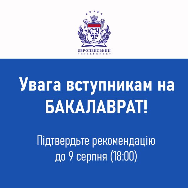 Нагадуємо! Щоб стати студентом бакалаврату Європейського університету, потрібно підтвердити рекомендацію до 9 серпня (18:00)!