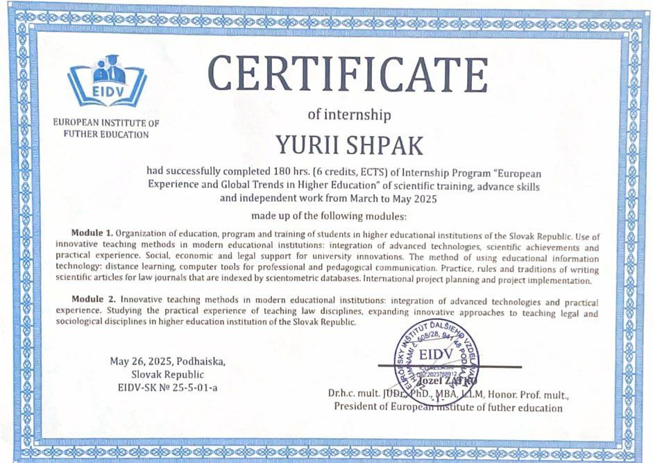 Вітаємо Шпака Юрія Анатолійовича з успішним проходженням програми міжнародного стажування