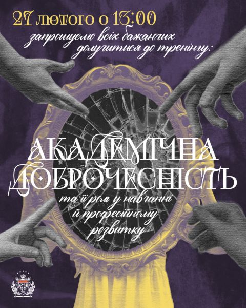 27 лютого запрошуємо студентів та викладачів на тренінг з академічної доброчесності, який проведе Козинець Анатолій Олександрович. Під час заходу ви зможе
